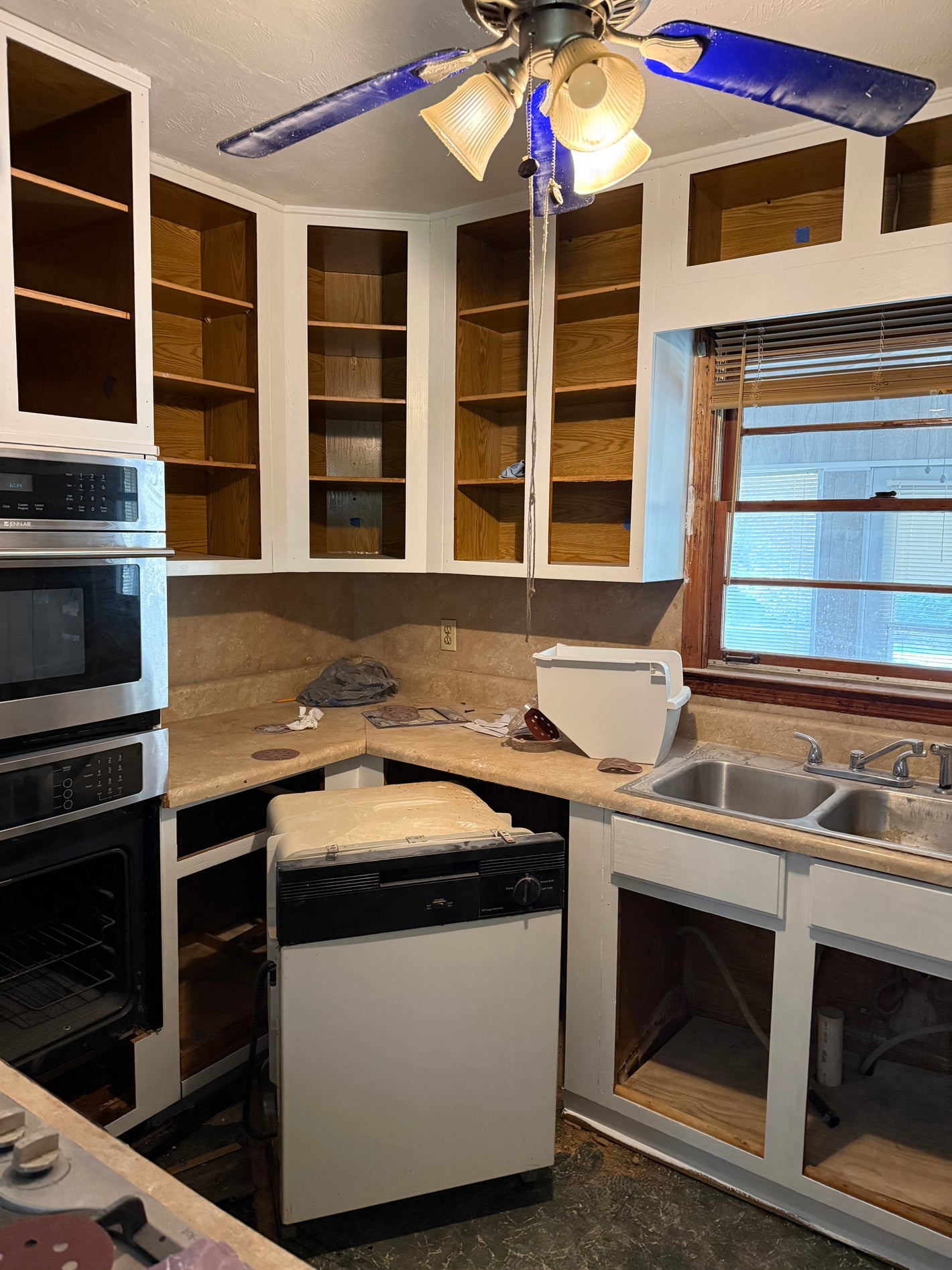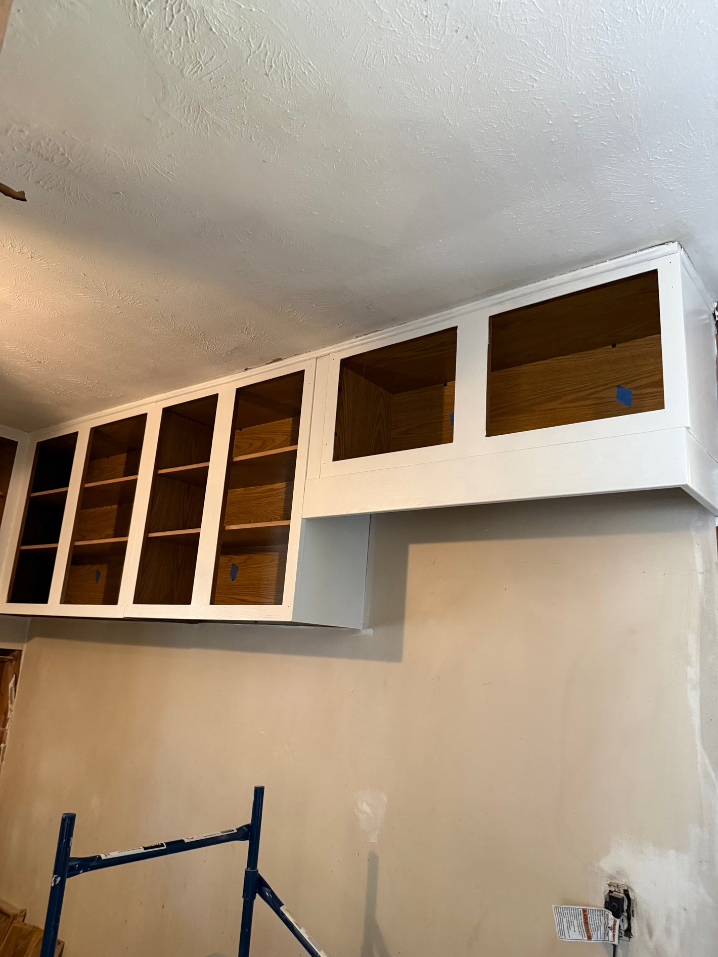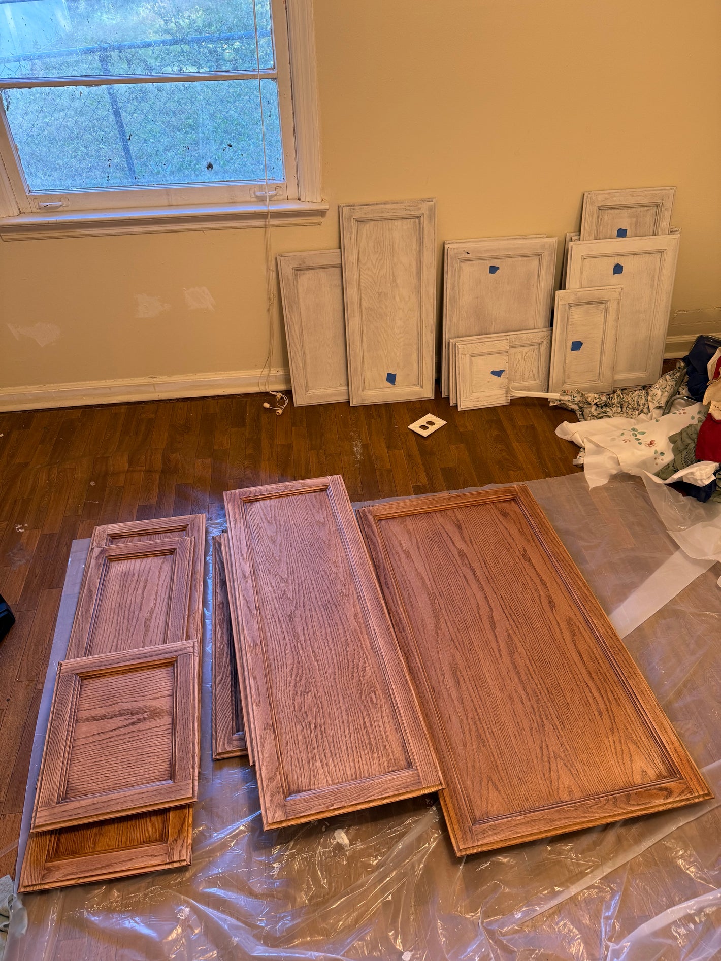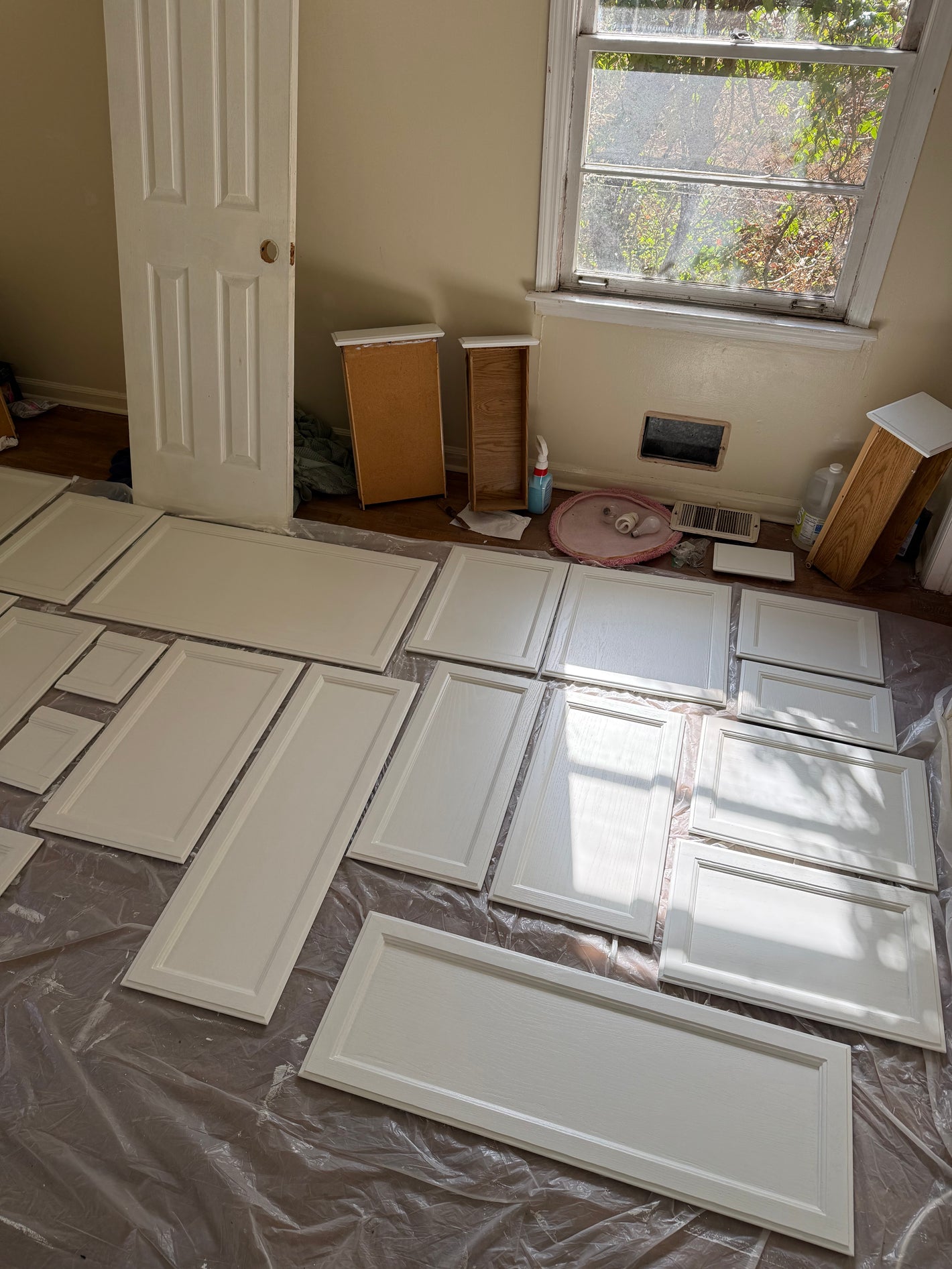 The owner replaced the sink cabinet as it was in rough condition on the bottom. But the rest of the doors are hung, just awaiting hardware!