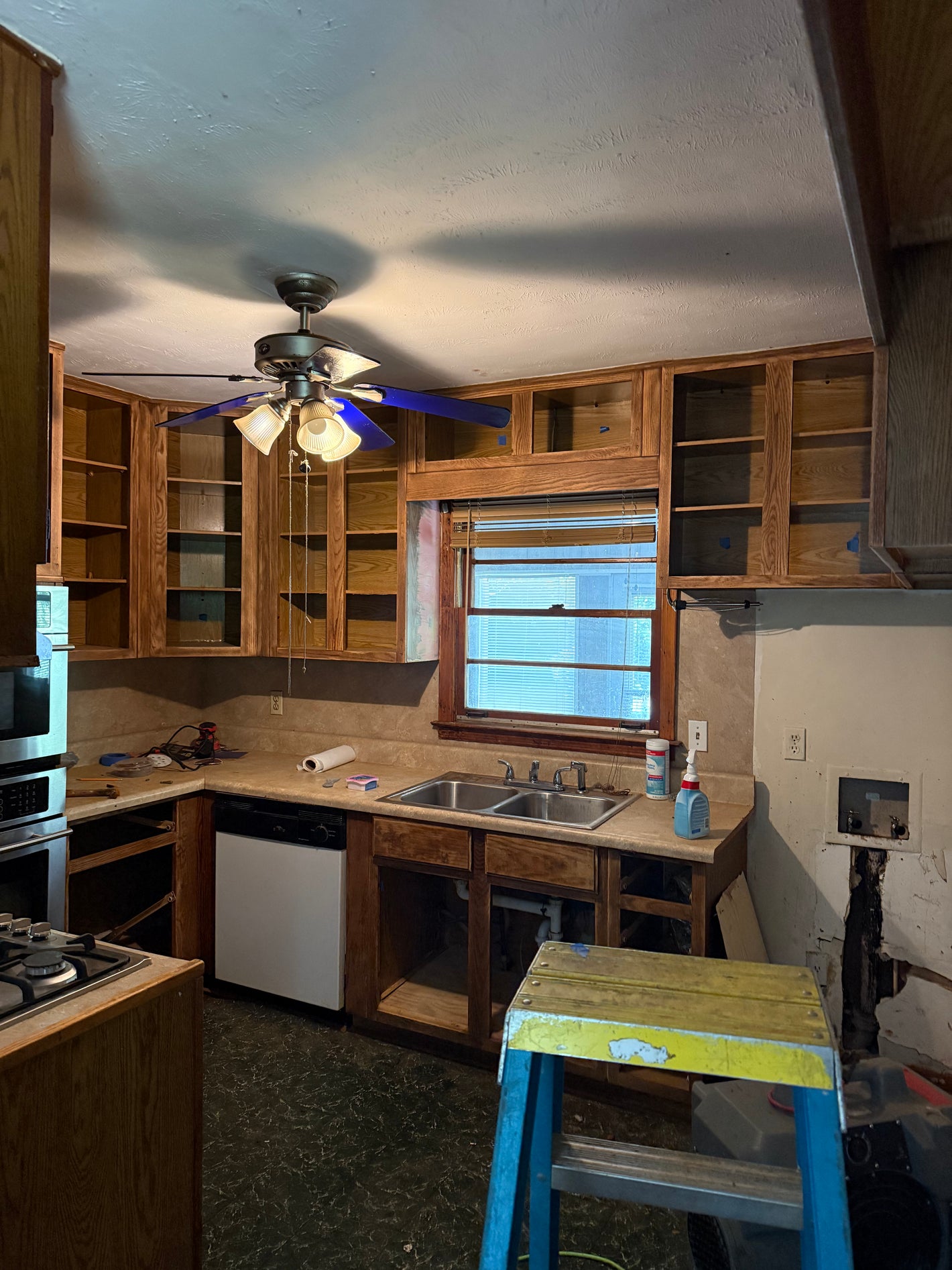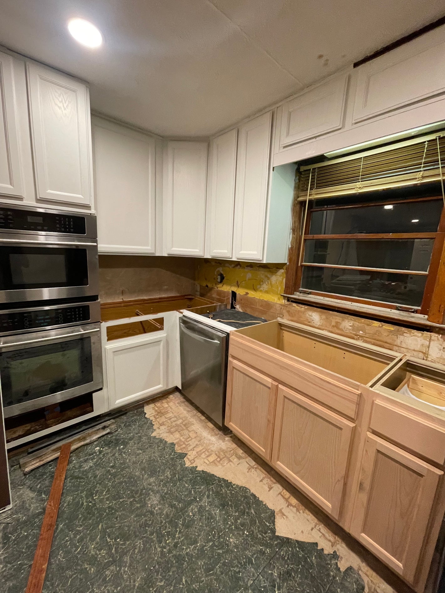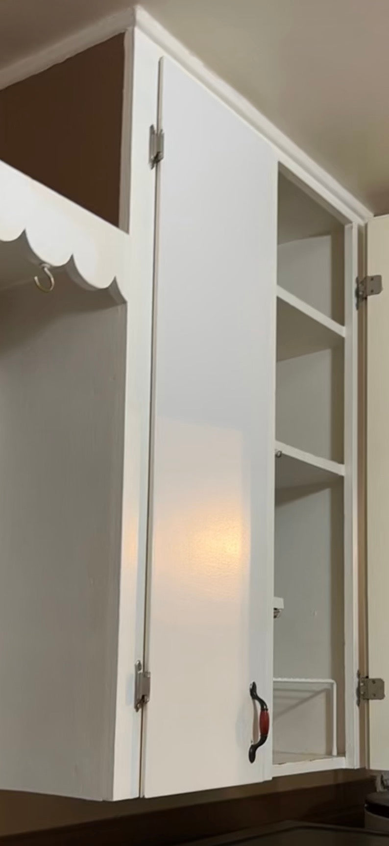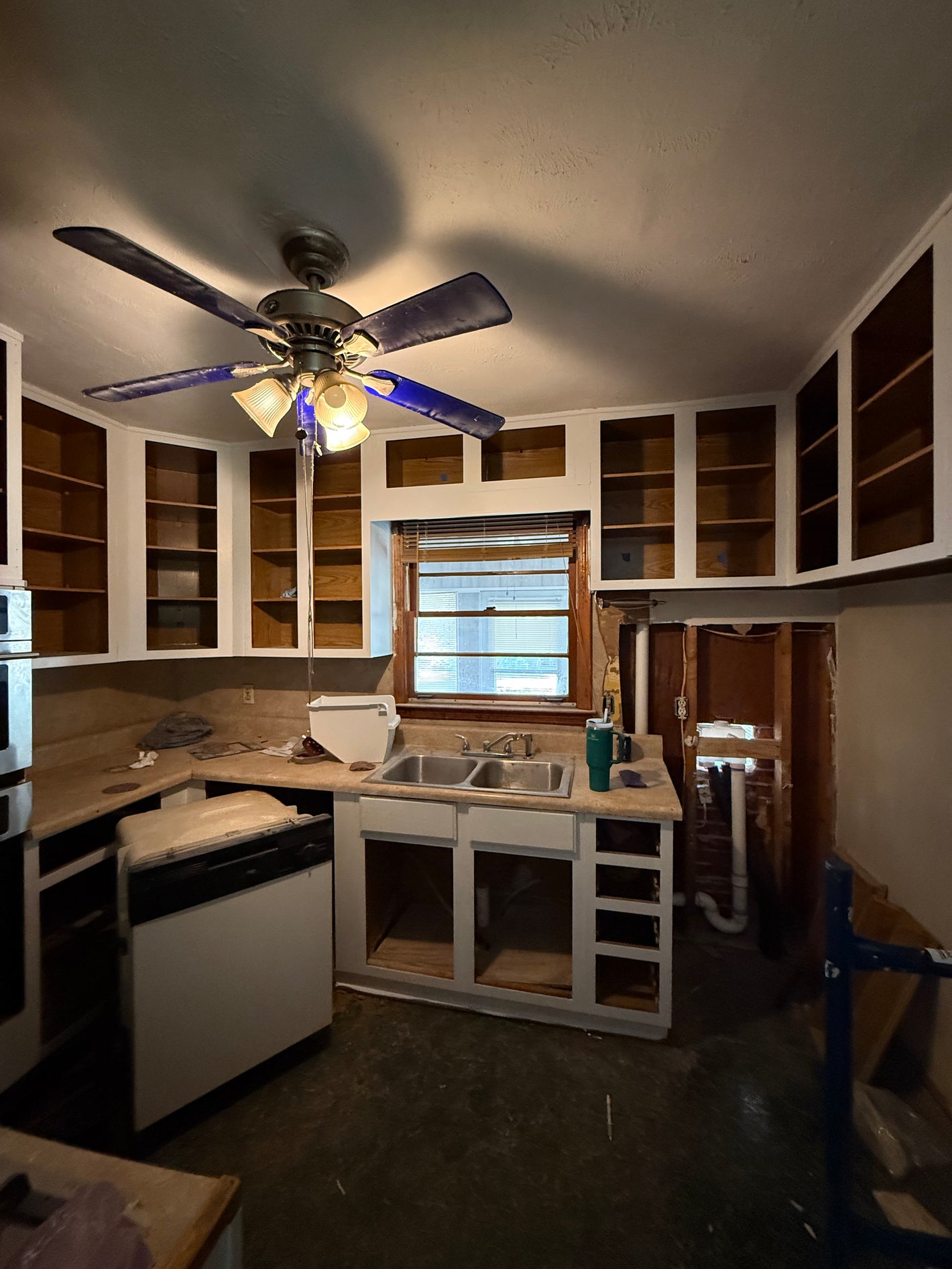 The owner replaced the sink cabinet as it was in rough condition on the bottom. But the rest of the doors are hung, just awaiting hardware!